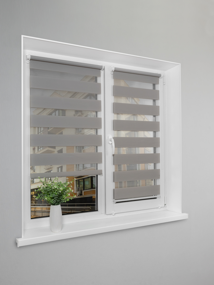 Рулонная штора День-Ночь «Грация 07» Серая с комплектом алюминиевых направляющих многофункциональная и практичная система светозащиты. Гарантируют полное затемнение в любое время суток. Ее приятный серый цвет прекрасно подойдет для любых помещений, как жилых, так и офисных. Все представленные размеры есть в наличии, что позволит вам выбрать штору под ваше окно.